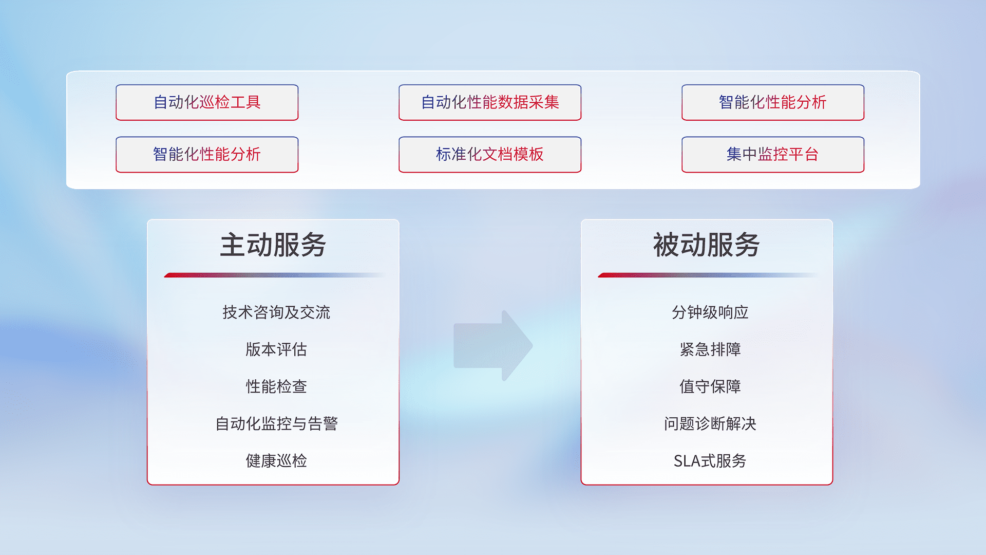 智能化工具和标准化文档,,,保障服务质量,,,提供主动服务(包含技术咨询、、、、版本评估、、性能检查、、、、自动化监控与告警、、、健康巡检)和被动服务包含(分钟级响应、、、紧急排障、、、值守保障、、、、问题诊断解决、、SLA服务)。。。
