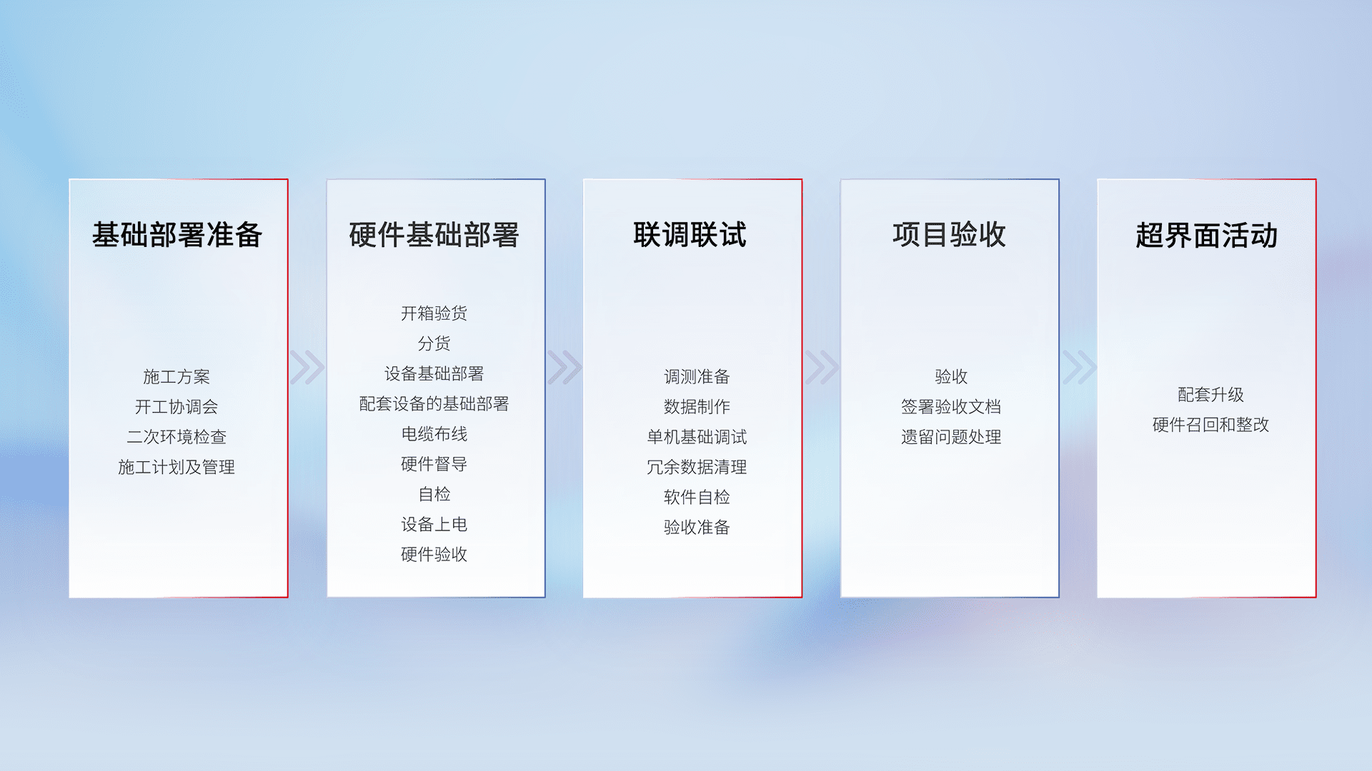 从基础部署准备、、、硬件基础部署、、、、联调联试、、、、项目验收、、、越界面活动的全过程可追溯,,保证施工质量和进度。。。